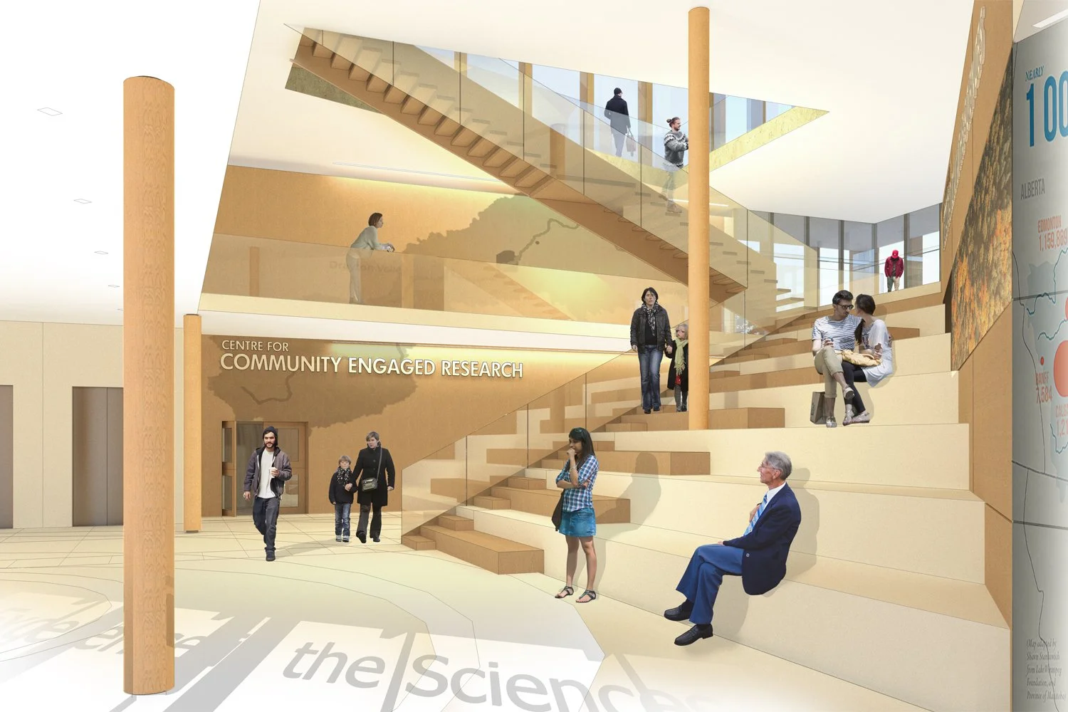 The King’s University in Edmonton is a liberal arts university expanding its programs in the sciences to provide a more integrated approach across multiple disciplines, and in doing so, attract more students to their well-established and recognized science programs. The Centre for Excellence in the Sciences combines innovative and sustainable building systems with non-traditional learning spaces, which allow for the integration of off-campus learning and traditional research methods.